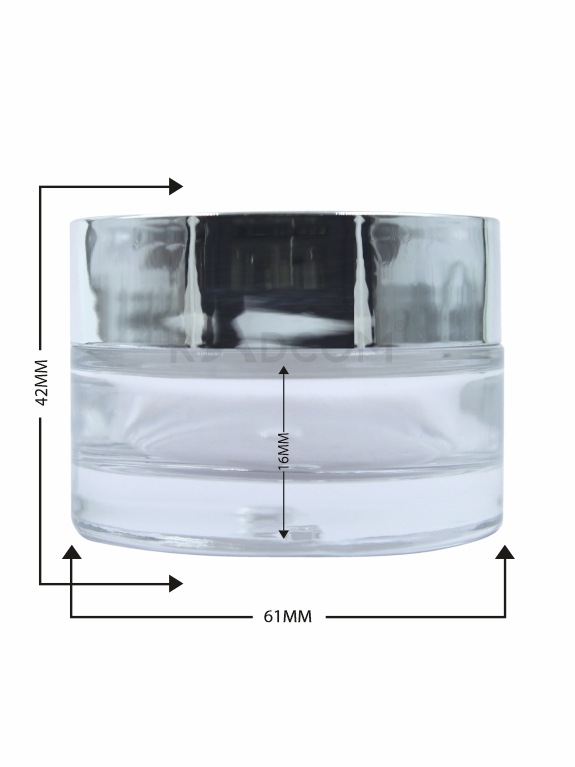 50GM Clear Shine Jar with Plastic Gold, Silver & Matt Silver UV Cap and Inner Lid\r\nPresent your premium skincare or cosmetic products in this elegant 50GM clear shine jar. Made from high-quality clear glass with a sleek glossy finish, this jar beautifully displays your product while maintaining a sophisticated appearance. The UV-coated plastic caps in Gold, Silver, and Matt Silver add a luxurious touch and help protect against light exposure. The included inner lid ensures an airtight seal to maintain freshness and prevent leakage. Perfect for creams, gels, balms, and other beauty formulations.